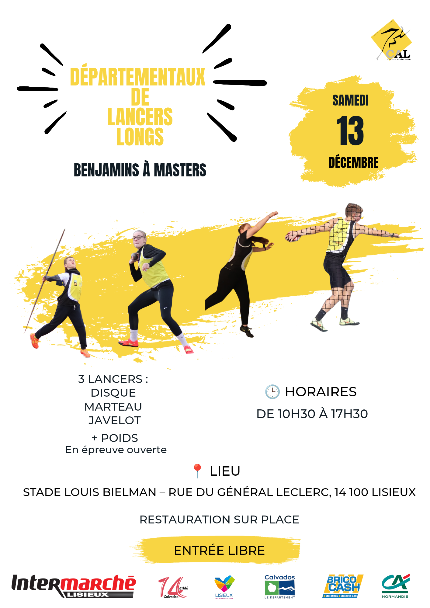Le samedi 13 décembre 2025 se déroule le championnat départementaux de lancers hivernaux à Lisieux (benjamins aux masters).